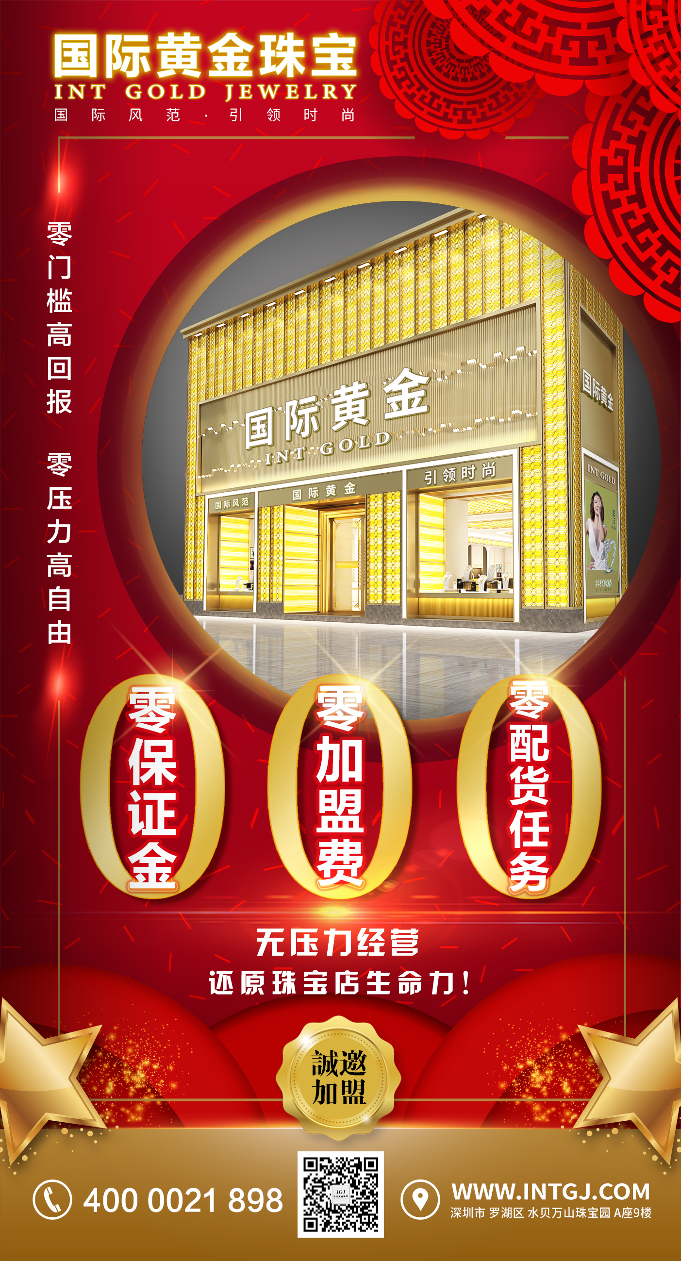 国际黄金珠宝审时度势积极响应国家号召,在终端门店受疫情影响,运营压力重重的情况下,为拯救正承受高压力的品牌加盟店,不计经营成本舍弃品牌收入,降低加盟店全年开支,守护中国实体珠宝门店命脉! 只为加盟商可以零门槛、高回报、零压力、高自由,焕发珠宝店生命力!